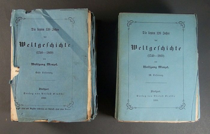Die letzten 120 Jahre der Weltgeschichte (1740 - 1860). Von Wolfgang Menzel. 34 Hefte (Lieferungen 1 - 32 und 35 - 36 von 36). Stuttgart, Verlag von Adolph Krabbe 1860. Kl. 8° (17 x 12,5 cm), Originalbroschuren. In Frakturschrift gedruckt. - Broschuren berieben, bestoßen, leicht randrissig und etwas fleckig. Seiten teils unaufgeschnitten. Heft 1 und 36 vordere Broschurhälfte liegt lose bei. Seiten teils leicht stockfleckig. - Sonst guter Zustand.
