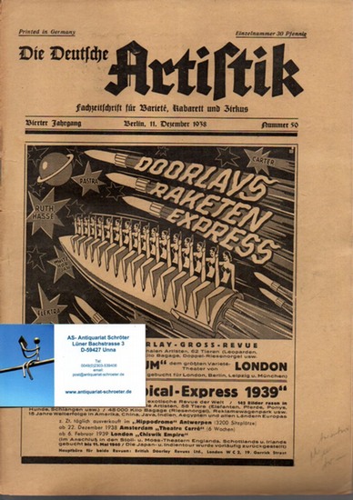 Die Deutsche Artistik. Fachzeitschrift für Variete, Kabarett und Zirkus. Vierter Jahrgang. Nummer 50. Verlag Deutsche Artistik Paul Riemer, Berlin, 1938. 87(1) S., Gr-8°, geheftete OBroschur. Zahlreiche s/w-Fotos diverser Künstler und Veranstaltungsorte. Werbeanzeige verschiedener Varietes und Kabaretts. Insgesamt ein hochinteressantes Magazin über die Artistenkultur der damaligen Zeit. Durchgehend mit Werbung, Veranstaltungshinweisen, Abbildungen. Wöchentliche Erscheinungsweise. Ein gutes Exemplar. Das Papier ist zeitbedingt vergilbt, einige Seitenecken geknickt, insgesamt aber ordentlich. Privater Stempel auf Rückseite. Sehr selten. Das Bild zeigt einen Ausschnitt aus dem Inhalt. Very rare. Advertising magazine about artists and locations. <**UTFAQ**>Actually it is not possible, sending books to the USA. Aktuell können keine Bücher in die USA versandt werden.**UTFAQ**>.