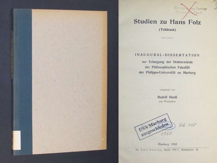 Studien zu Hans Folz (Teildruck). Inaugural-Dissertation zur Erlangung der Doktorwürde der Philosophischen Fakultät der Philipps-Universität zu Marburg, vorgelegt von Hellmut Hoffmann. Berlin: Dr. Emil Ebering 1932. 8, (2) Seiten. 8° (17,5 - 22,5 cm). Privater Halbleinenband mit Papierrückenschild. [Hardcover / fest gebunden]. Teildruck! Nur Teil 1: "Komposition und Stil der Meisterlieder". Untersuchung zu dem Meistersänger Hans Folz, dem Reformator des Meistergesangs, Arzt & Bariber in Würzburg. - Ausgeschiedenes Bibliotheksexemplar (ex-library copy) mit Rückensignatur, Inventarnummern und Stempeln auf Titelblatt sowie wenigen Seiten. - Einband mit Lichtkanten. Rücken ausgeblichen. Innenfalz leinenverstärkt sowie Bundsteg an einigen Stellen mit Japanpapier hinterlegt. - Insgesamt sauberes und gut erhaltenes Exemplar.