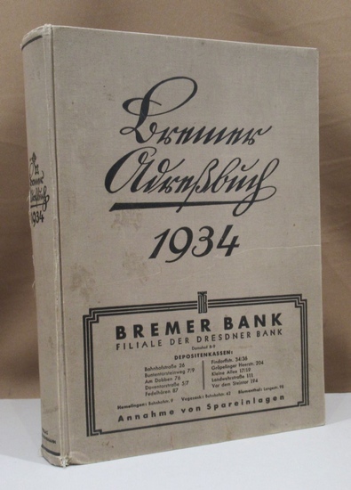 Adreßbuch der Freien Hansestadt Bremen, des Landgebiets und Vegesacks. Neue Folge 60. Jahrgang. Bremen, Schünemann 1934. 1934. 4° 48, 400, 300, 78 S., 1 Bl., 32 S. Orig.-Leinen. Einband leicht fleckig u. etwas beschabt, Außengelenke leicht angeplatzt, papierbedingt gebräunt.