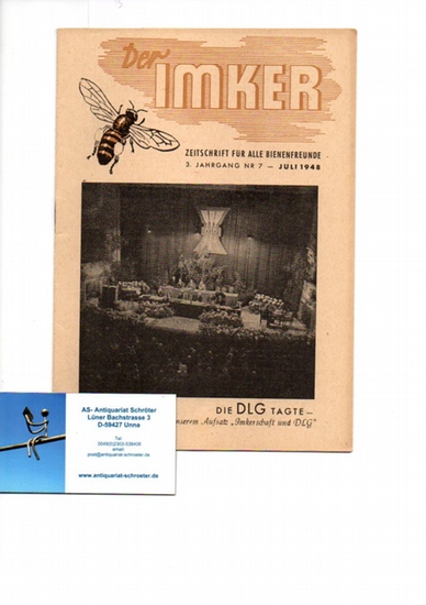 Der Imker. Zeitschrift für alle Bienenfreunde. Nr. 7 / Juli. 3. Jahrgang. Deutscher Bauernverlag, Berlin, 1948. Seiten (2)129 - 147(3), ca DIN A5, Klammerheftung. Mehrere Seiten nur mit Werbeannoncen. Das Papier etwas unfrisch, insgesamt aber ein gutes Exemplar. Sehr selten. Very rare. Good copy. <**UTFAQ**>Actually it is not possible, sending books to the USA. Aktuell können keine Bücher in die USA versandt werden.**UTFAQ**>.
