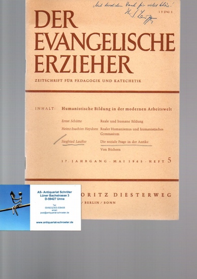 Der Menschheitsgedanke im Hellenismus. Sonderdruck aus: Studium Generale. 14. Jahrgang, Heft 10. Springer Verlag, Berlin u.a, 1961. Seiten 583-592, geheftete Seiten, auf der ersten Seite eine handschriftliche Widmung des Autors ("Mit herzlichem Dank und besten Neujahrswünschen! Wir rufen Sie in Bälde einmal an, Ihr S. Lauffer".). Das Exemplar stammt aus der Bibliothek des Schriftstellers Herbert Günther. Die Seiten einmal auf DIN A5 quer gefaltet. Gutes Exemplar. With a handwritten dedication by the author. Good copy. <**UTFAQ**>Actually it is not possible, sending books to the USA. Aktuell können keine Bücher in die USA versandt werden.**UTFAQ**>.