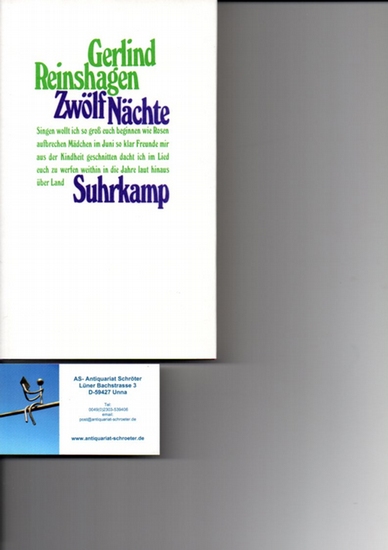 Zwölf Nächte. Signierte Blankokarte inliegend. Suhrkamp Verlag, Frankfurt, 1990. 142 Seiten, OPappband m. OU, Blankokarte mit Datum (19.9.93) und Signatur. 2. Auflage. Wohl ungelesenes Exemplar. Good copy. With a separat signed card by the author. <**UTFAQ**>Actually it is not possible, sending books to the USA. Aktuell können keine Bücher in die USA versandt werden.**UTFAQ**>.