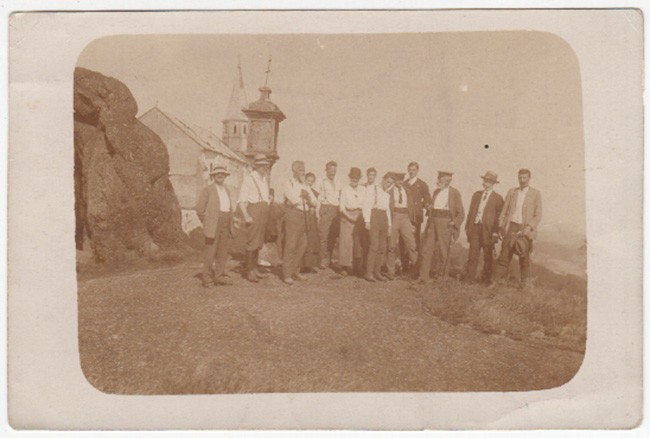 Gruppenbild von 13 Männern vor Marterl und Kirche. _. Orig.-Photokarte. 9 x 13, 5 cm. In gutem Zustand. Gelaufen. August 1919.