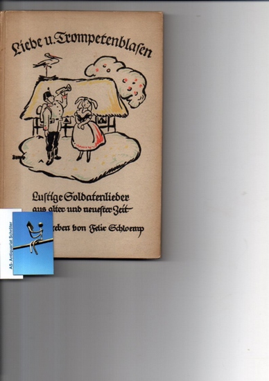 Liebe und Trompetenblasen. Lustige Soldatenlieder aus alter und neuester Zeit. Mit vielen, zum Teil farbigen Bildern von Fritz Wolff. Georg Müller Verlag, München und Leipzig, 1914. 134(10) Seiten, illustrierter OPappband, einige der Abbildungen sind handkoloriert. Lesebändchen, farbiger Kopfschnitt. 5. Auflage. Der Rücken nachgedunkelt. Ein gutes Exemplar. Am hinteren Vorsatz wurde etwas montiertes entfernt. Reste der Befestigung sind sichtbar. Good copy. <**UTFAQ**>Actually it is not possible, sending books to the USA. Aktuell können keine Bücher in die USA versandt werden.**UTFAQ**>.