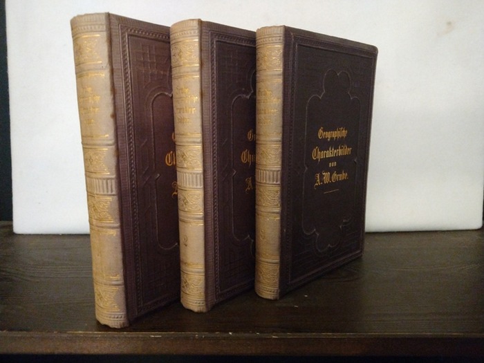 Geographische Charakterbilder in abgerundeten Gemälden aus der Länder- und Völkerkunde. Nach Musterdarstellungen der deutschen und ausländischen Literatur für die obere Stufe des geographischen Unterrichts in Schulen, sowie zu einer bildenden Lectüre für Freunde der Erdkunde überhaupt bearbeitet von A.W. Grube. Erster [bis dritter] Theil (= vollständig). 3 Bände (= vollständig). Band 1 & 2 in 15., vermehrter Auflage, Band 3 in 11. Auflage. Leipzig: Friedrich Brandstetter 1878. (XII), 751, (1); (VIII), 563, (1); (XV), 496 Seiten. Frakturdruck. Mit drei Frontispices (Stahlstichansichten des Piz Munteratsch, der Cedern des Libanon und des Kölner Doms) und einigen Abbildungen im Text. Gr. 8° (22,5-25 cm). Violette Orig.-Leinenbände mit reicher Gold- und Blindprägung auf Rücken und Deckeln, abgeschrägten Deckelkanten und netzmarmorierten Schnitten. Der 3., sich auf Deutschland beziehende Band auch unter dem Einzeltitel 'Charakterbilder deutschen Landes und Lebens für Schule und Haus' erschienen. Dieser Band enthält zahlreiche, zum Teil anekdotische und humorvolle Schilderungen aus vielen deutschen Regionen und Landschaften mit teilweise treffenden Darstellungen der jeweiligen ortsüblichen Bevölkerungen. Zum Beispiel werden die gutmütig-phlegmatischen Oldenburger mit den Bewohnern temperamentvollerer Regionen verglichen. - Außerordentlich unterhaltsame und empfehlenswerte Lektüre. - Mit dem schönen, eindrucksvollen Stahlstich (pfeiferauchende Levantiner in traditioneller Kleidung in libanesischem Zedernhain) von Carl Eulenstein in Band 2. - Rücken ausgeblichen und gering fleckig. Ecken leicht bestoßen. - Zeitgenössischer Besitzeintrag in Tinte auf Vorsätzen und Titelblättern. Papier gleichmäßig leicht gebräunt, sonst fleckenfrei. - Die Stahlstiche sauber und in gutem Abdruck, die Hemdchen etwas fleckig.