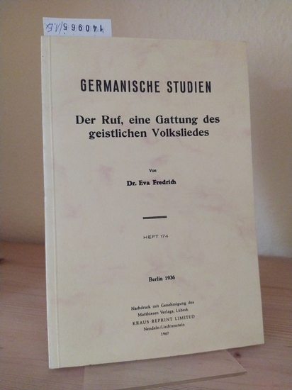 Der Ruf, eine Gattung des geistlichen Volksliedes. [Von Fredrich Eva]. (= Germanische Studien. Heft 174). Reprint der Ausgabe Berlin, Verlag Dr. Emil Ebering 1936. Nendeln/Liechtenstein: Kraus Reprint 1967. 165, (1) Seiten. Gr. 8° (22,5-25 cm). Fadengeheftete Orig.-Broschur. [Softcover / Paperback]. Reprint-Ausgabe in Lizenz des Matthiesen Verlags Lübeck, der den Ebering Verlag übernommen hatte. - Schnitt etwas angestaubt und etwas stockfleckig. Rücken schwach ausgeblichen. Leichter Lagergeruch. - Davon abgesehen gutes, sauberes Exemplar ohne weitere Gebrauchsspuren.
