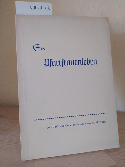 Ein Pfarrfrauenleben. Aus Dank und Liebe beschrieben von W. Gerber. Herausgegeben vom Pfarrschwesterkreis in der EKiD. Pfarrschwesternkreis in der EKiD. 34, (2) Seiten. Mit 1 fotografischen Abbildung. 8° (17,5-22,5 cm). Orig.-Broschur. [Softcover / Paperback]. Einband leicht angestaubt. Hinterer Umschlagdeckel etwas fingerfleckig, mit kleineren Knickspuren. Rücken gebräunt. - Insgesamt sauberes und gut erhaltenes Exemplar.
