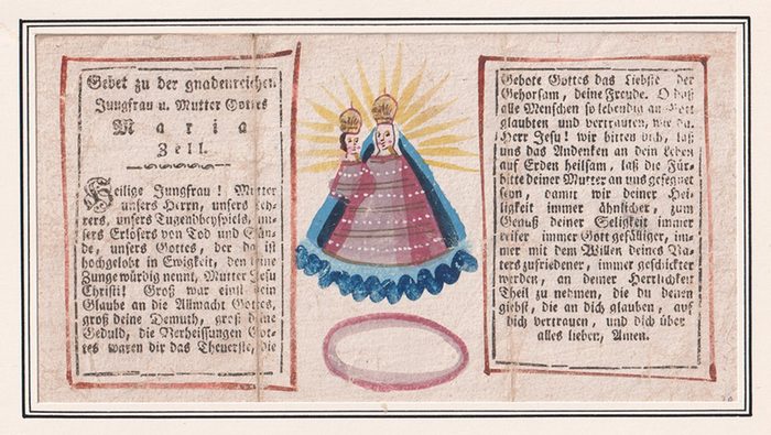 Gebet zu der gnadenreichen Jungfrau u. Mutter Gottes Maria Zell. o. O. [um 1780/1800?]. Gebetszettel mit Gouache und typographischem Text auf Kreidepapier. 11, 7 x 22 cm. (Blattgr.). Mit zwei vertikalen Falzspuren, Kreidegrund etwas berieben. Zwischen zwei typographischen Textfeldern ist eine Darstellung des Mariazeller Gnadenbildes 'Magna Mater Austriae' in Gouache eingefügt.
