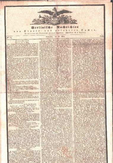 Berlinische Nachrichten von Staats- und gelehrten Sachen. Im Volksmund genannt: "Onkel Spener". (Redacteur: S. H. Spiker). Konvolut von 8 Ausgaben der Zeitung, dokumentierend die März-Aufstände in Berlin. Berlin: In der Haude und Spenerschen Zeitungs-Expedition. 1848. 49 x 30 cm. Vorhanden: No. 66, 68 - 72 (Sonnabend 18. März - Sonnabend 25. März 1848). 4 Ausgaben mit Beilage; No. 69 mit einer einseitig bedruckten Zweiten Ausgabe; No. 71-73 (23. - 25. März) schwarzumrandet. Bewegende minutiöse Beschreibung des Trauerzuges mit 187 Särgen. - Mit geglätteter Mittelfalte, etwas stockfleckig, insgesamt gute Erhaltung. - Neben der Vossischen war die Spenersche Zeitung lange Zeit die auflagenstärkste und bedeutendste Zeitung in Berlin.