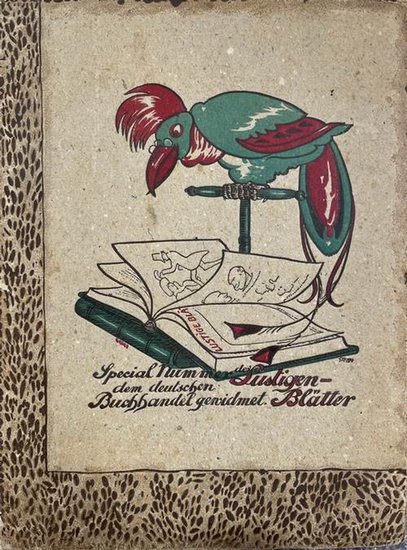 CANTATE NUMMER DER LUSTIGEN BLÄTTER Dem deutschen Buchhandel gewidmet. Berlin: Verlag der Lustigen Blätter. 21. Mai 1905. Mit Abb., farbig und s/w., darunter 2 Karikaturen von Gino von Finetti . 34 (2) S. 30 x 22 cm. Enthält 19 Seiten mit Werbeanzeigen. Zwei Blätter mit kleinem Fleck (hell) an oberer Ecke.