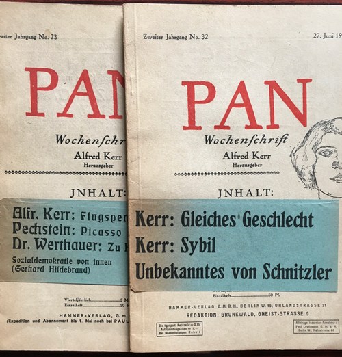 PAN. Halbmonatsschrift, später Wochenschrift. Hrsg. von WILHELM HERZOG und PAUL CASSIRER, ab Jg. 2, Nr. 20 von ALFRED KERR. 1.-4. Jahrgang, bis auf 9 Hefte (3. Jg.), komplettes Exemplar dieser sehr seltenen Zeitschrift. Berlin,: Berlin. 1910/11-19124/15. Einige Hefte mit Illustrationen. Dietzel-Hügel 2358; Raabe Nr. 3, Schlawe II: "Pan, ein radikales kritisches Blatt... Entschieden demokratisch antiwilhelminisch vertrat das Blatt auch künstlerisch die Avantgarde, brachte gern provozierende Arbeiten und förderte Entdeckungrn...Benn, Klabund, Heym, Däubler..." - Vorhanden: 1. Jg. 1910/11, H. 1-22 (Nov.-Sept.); 2. Jg. 1911/12, H. 1-45 (Okt.-Sept.); 3. Jg. 1912/13, H. 1-21 (statt 31, Okt.-Febr.); 4. Jg. 1914/15, H. 2/3 (1. April 1915), ist damit das letzte Heft der Reihe. Nicht erschienen sind die Hefte: 3. Jg., H. 31 und 4. Jg. H. 1. - Mit Beiträgen von: A. Zweig, Brod, Kerr, Schickele, Slevogt, Corinth, Bernstein, Hiller, Altenberg, Kolbe, Wassermann, R. Leonhard, Meyrink, Bahr, Friedländer, Adler, Schönberg, Beckmann, Westheim, Liebermann, Dehmel, Freud, Pechstein, H. Mann, Werfel u.v.a. - Papierbedingt Seiten gering gebräunt. Bis auf das letzte Heft gute bis sehr gute Innenerhaltung.
