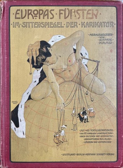 EUROPAS FÜRSTEN. Im Sittenspiegel der Karikatur. Berlin.: Hermann Schmidt. o.J.(1908). 468 Abb. u. 72 Farbtafeln. VI,1 Bl., 472 S. 28 x 22 cm. Hayn-Gotendorf III, 504. - Erste Ausgabe. 1.-10. Tsd.- "Die Tatsache, daß die Geschichte der Fürstenkarikatur und der daran knüpfenden politischen Satire den überwiegenden und wichtigsten Teil der gesamten Karikaturgeschichte bildet, möge unser Unternehmen als einen immerhin interessanten Beitrag zur Geschichte der Menschheit rechtfertigen" (Vorwort S.VI). Hier wurden Zeichnungen aus den bekanntesten (Satire)-Zeitschriften Englands, Frankreich und Deutschland gesammelt vom 19. Jahrhundert bis zum Erscheinen dieses Bandes. - Kleiner Einriss an der Falz, Fuß und Kopf berieben, die Ecken bestoßen.- Innen sauberes Exemplar. :.