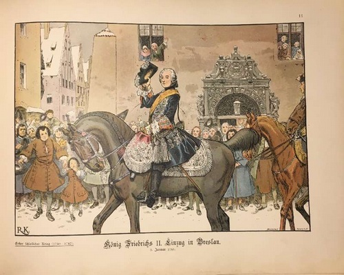Der Alte Fritz in 50 Bildern für Jung und Alt. Berlin: Paul Kittel. 1895. 50 Illustrationen in Farbenbuchdruck von Chromotypieplatten. 2 Bl. Text. Quer-4to. Orig.-Leinenband mit Farbbildnis auf Golduntergrund und goldgeprägten Titel. Seebaß I/1632; Wegehaupt II/39; Schug, Bilderwelt 1841. - Die Tafeln am unteren weißen Rand ab und zu etwas fleckig. Vorderdeckel und Ecken etwas berieben, der Rücken mit kleinen Flecken. - Insgesamt schönes Exemplar.