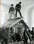 Anatol. [Originalfotografie - Vergrößerung]. 40 x 30,5 cm., Umschlag Etwas lichtrandig, sonst guter, frischer Abzug. Anatol [d.i. Karl Heinz Herzfeld] 1931 im ostpreussischen Insterburg geboren, lebt in der Nähe von Düsseldorf als freier Künstler. Begann als Bereitschafts- und Verkehrspolizist, studierte 11 Semester bei Joseph Beuys an der Düsseldorfer Kunstakademie. - Die Fotografie zeigt den Künstler auf einer von ihm gefertigten Holzhütte stehend, wohl in der Kunstakademie Düsseldorf. Im Vordergrund weitere Personen. Vergrößerung, früher Schwarz - Weiss - Abzug, verso mit neuerem Stempel des Fotografen.