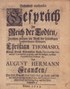 Besonders curieuses Gespräch Im Reich der Todten, Zwischen zweyen im Reich der Lebendigen hochberühmten Männern, Christian Thomasio ... Und August Hermann Francken ... [TEIL 1 (von 4?)]. Ohne Ort, ohne Verlag / Drucker, 1729. 56 S. (20 x 16 cm). Lose Lagen. VD18 15549143-001. - BEIGABE: [Tl. 3=] Fernere Fortsetzung Des Gesprächs im Reiche derer Todten, zwischen zweyen im Reiche der Lebendigen hochberühmten Männern, Christiano Thomasio, JCto, und August Hermann Francken. Ohne Ort, Verlag u. Drucker, 1729. 54 S. (20 x 16 cm.). Geheftet. - Christian Thomasius (1655-1728), Jurist u. Philosoph, gilt als Wegbereiter der Frühaufklärung in Deutschland; er trug durch sein Eintreten für eine humane Strafordnung wesentlich zur Abschaffung der Hexenprozesse u. der Folter bei. Er war Rektor der Friedrichs-Universität zu Halle u. Professor an der dortigen juristischen Fakultät (vgl. ADB 38, S. 93-102). - August Hermann Francke (1663-1727), pietistischer Theologe, Pädagoge u. Dichter, Professor in Halle u. Prediger an der dortigen Ulrichs-Kirche sowie Direktor des Waisenhauses (ADB 7, S. 219-231). - "Gespräche in dem Reiche derer Todten" war eine ihrerzeit erfolgreiche Moralische Wochenschrift, die 1718-1739 von David Faßmann (1685-1744) in Leipzig herausgegeben wurde u. über das Leben berühmter Staatsmänner u. Gelehrter berichtete; unter Benutzung dieses Titels erschien nun diese Schrift zu Thomasius u. Francke, "mit der Promesse, daß, wenn dem Leser solches Gespräch gefällt, mit mehrern zu dienen"; wiederum mit so viel Erfolg, daß der "Ferneren Fortsetzung" vorausgeschickt wird, "daß eine falsche Fortsetzung dieses Gesprächs schon vor dieser itzigen herausgekommen, selbe ist von einer fremden eigen-nützigen Feder, nicht aber von dem Verfasser des ersteren geschrieben..." . Beide Teile ohne Frontispiz, mäßig gebräunt bzw. braunfleckig, Heftung gelockert; Tl. 1 Titel lose; Tl. 3 fehlen S. 11-14. - Am Ende von Tl. 3 wird "die Continuation dieses Gesprächs" angekündigt.