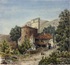 Burgähnliche Anlage im Gebirgstal (Piemont). Aquarell und Tusche. 1883. Monogramiert und datiert "A.W. März 83." Auf festem Zeichenpapier. 17,8 x 19 cm (blattgroß). Sehr farbfrisches voll ausgeführtes Aquarell des Berchtesgadener Malers Adalbert Waagen. Die Anlage ähnelt einer Burg und hat links im Hintergrund einen schlanken, hohen Turm, der vor dem Gebirgszug aufragt. Die Bäume sind voll belaubt, obwohl das Aquarell mit "März. 83" bezeichnet ist. Es handelt sich bei dem Blatt also wohl um eine Atelierarbeit. - Der deutsche Maler Adalbert Waagen war von 1855 bis 1858 Schüler von Albert Zimmermann in München. Ab 1868 lebte und arbeitete er in Berchtesgaden. - Sehr gut erhalten.