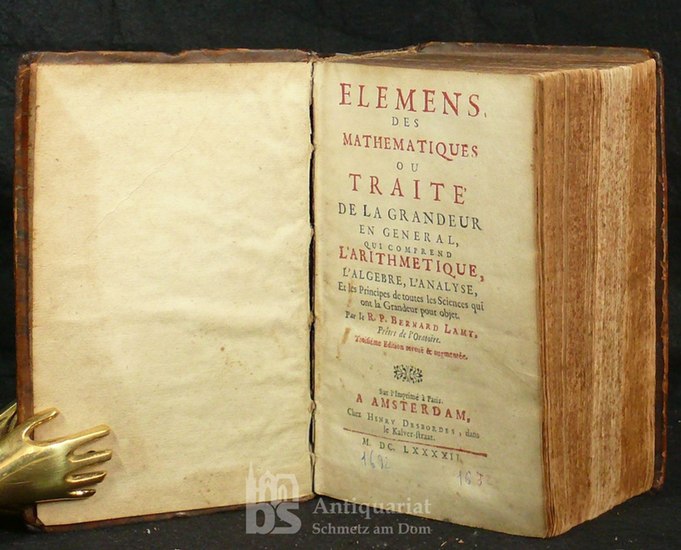 Nouvelle Geometrie pratique, contenant la trigonometrie theoretique & pratique (...). Mit einem gestochenen Frontispiz und vielen Abbildungen in Holzstich im Text. Paris, Michallet 1693. 12°. 2 Bll., 296 S., 4 Bll. Ldr der Zt. Einband restauriert, Fehlstellen am Rücken ergänzt. Ein Gelenk brüchig. Der 2. Teil (Ozanam) im Bundsteg etwas wasserrandig, sein Frontispiz mit Ausriß im weißen Rand. Einriß am 1. Titel (Lamy) unterlegt. Hs. Erscheinungsdaten an den drei Titeln (Kuli). (Vorgebunden): Lamy, Bernard. Elemens des Mathematiques ou Traité de la Grandeur (...). Troisième Edition revuë & augmentée. Amsterdam, Desbordes 1692. (11 Bll. - statt 12, fehlt das Frontispiz -, 416 S., 4 Bll.). - (Nachgebunden): [Vitruvius], Architecture Generale de Vitruve reduite en abregé par [Claude] Perrault (...). Derniere Edition enrichie de figures en Cuivre. Mit einem gestoch. Frontispiz, einer gestoch. Titelvignette und elf Kupfertafeln. Amsterdam, Aux dépens des Huguetan 1681 [1691?]. (Frontispiz, 11 Bll., 224 S., 1 Bl., 11 Tafeln, 12 Bll.). - Zu Lamy vgl. DSB VII.610f. Gottwald, Lexikon S. 271. Hier die 3. Auflage, das Buch erschien zuerst 1680 unter dem Titel 'Traité de la grandeur en général'. Poggendorff I.1363. - Zu Ozanam: Vermutlich 2. Auflage der 1684 zuerst erschienenen 'Géométrie pratique'. Vgl. Poggendorff II.341 und DSB X.264. Gottwald, Lexikon S. 356. - Zu Vitruv/Perrault vgl. Poggendorff II.406 (dort frühere Ausgabe); Biographie Perraults in DSB X.519ff. Das Frontispiz ist '1691' datiert, deshalb vermutet Kat. Ornamentstichsammlung 1819 das spätere Erscheinungsdatum.