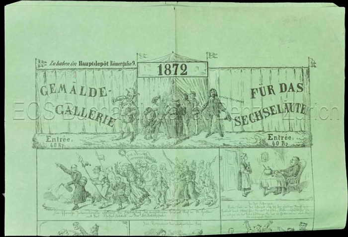 Gemälde-Gallerie für das Sechseläuten. 1872. Basel, Schnellpressendruck E. Hindermann, 1872. 2 gef. lithogr. S. mit Illustr. Format: 62 x 46 cm. + Wichtig: Für unsere Kunden in der EU erfolgt der Versand alle 14 Tage verzollt ab Deutschland / Postbank-Konto in Deutschland vorhanden +, Abb. Eine von zahlreichen «inoffiziellen» Publikationen zum Sechseläuten. «Bis spät gegen Ende des 19. Jahrhunderts war das Sechseläuten so etwas wie ein ?Fastnachts-Ersatz? und das stets wiederkehrende Leitmotiv dieses Anlasses war: Es ist nur einmal Jux im Jahr - nur einmal Sechseläuten. Dies erklärt denn auch, warum neben den offiziellen Anlässen, den organisierten Festzügen der Zünfte und Jugend-Umzügen in jedem Jahr auch spontane Umzüge sowohl von den Zünften aus auch von der Jugend durchgeführt wurden und durch Programme, Einladungen und Beschreibungen der Nachwelt erhalten geblieben sind» (Honegger, S. 9). ? Blattrand mit kl. Einrissen.
