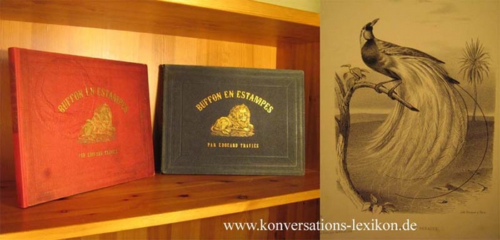 Buffon en Estampes. Types du règne animal. Planches & illustrations, 2 Bände, Paris o. J. (um 1850) Paris, Ledot Ainé, um 1850. Vollständiges Werk in zwei Bänden. Grüner sowie roter Original-Ganzleinenband im Querformat 36 x 26,5 cm. Mit goldgeprägten Rücken- und Deckeltiteln sowie goldgeprägter Deckelillustration (liegender Löwe). Dreiseitiger Goldschnitt. Farbige Vorsätze. Beide Bände mit zusammen 48 großformatigen gestochenen Tafeln, die zumeist jeweils zwei Tierdarstellungen enthalten, und jeweils zugehörigen Textseiten. Édouard Traviès (1809 - 1870) kann als einer der brillantesten Tierzeichner und -illustratoren des 19. Jahrhunderts gelten. Seine Arbeiten (häufig Vögel und Insekten, aber auch andere Tiere), die er zwischen 1831 und 1866 regelmäßig im Pariser Salon ausstellte, zeigen eine bis dahin kaum erreichte Präzision und Ausdruckskraft, die auch heute noch begeistert. Original-Zeichnungen und -Aquarelle des Künstlers sind im internationalen Auktionshandel begehrt. Druckwerke bzw. Sammelwerke Traviès' - wie das hier vorliegende - sind im Original heute kaum noch erhältlich. Beide Bände in gutem Zustand: Bei Band 1 Kapitale etwas ausgefranst, oben mit leichten Anrissen, sonst sehr sauber erhalten. Bei Band 2 wurde der Rücken unter Verwendung des Original-Rückenschildes fachmännisch erneuert. Diese Arbeit ist sehr gut ausgeführt und fällt kaum ins Auge. Vorderdeckel etwas berieben und geringfügig fleckig sowie mit erkennbarem Abdruck eines runden Gegenstandes. Die Tafeln partiell geringfügig fleckig, sonst gut erhalten und ohne Läsionen. Schönes Exemplar dieses brillant gestaltetes Werkes der Tier-Illustration. Weitere Fotos auf der Homepage des Antiquariats (bitte Art.-Nr. auf der Angebotsseite in das Suchfeld eingeben) und auf Anfrage. Beautiful copy of this brilliantly crafted work of Animals Illustration. More photos on the website of the antiquarian bookstore (please quote the article number on the supply side in the search box) and on request. Beau copie de ce travail brillamment conçu des animaux Illustration. Plus de photos sur le site web du librairie antiquaire (s'il vous plaît mentionner le numéro de l'article sur le côté de l'offre dans la zone de recherche) et sur demande.