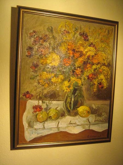 Original-Ölgemälde: Wildblumen in einer Vase (undeutlich signiert) Zweite Hälfte 20. Jahrhundert. Original-Ölgemälde (Öl auf Leinwand). Format: 65 x 81,5 cm (Rahmenmaß: 73,5 x 89,5 cm). Unleserlich signiert; nicht datiert. Neuer Rahmen (dunkelgrün mit innenliegender Goldleiste). Das Bild zeigt einen Wildblumenstrauß in einer Vase in überwiegend rötlich-gelben Farben. Pastoser Farbauftrag. Sowohl Gemälde als auch Rahmen in tadellosem Zustand. Lebendiges, sehr dekoratives Blumen-Stilleben in gelungenem farblichen Arrangement. Weitere Fotos auf der Homepage des Antiquariats (bitte Art.-Nr. auf der Angebotsseite in das Suchfeld eingeben).