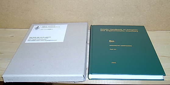 Sn Organotin Compounds Part 21: Compounds with Bonds between Tin and Transition Metals of Groups III to VII. (= Gmelin Handbook of Inorganic and Organometallic Chemistry / Gmelin Handbuch der Anorganischen Chemie). 8th Edition / Achte völlig neubearbeitete Auflage,. Springer Verlag, Berlin / New York 1994. XIII/309 pp., 4°,. Originalgebunden im Schuber, sehr gut erhaltenes Exemplar, Text in Englisch / original hardcover in slipcase, very fine, text in English,.