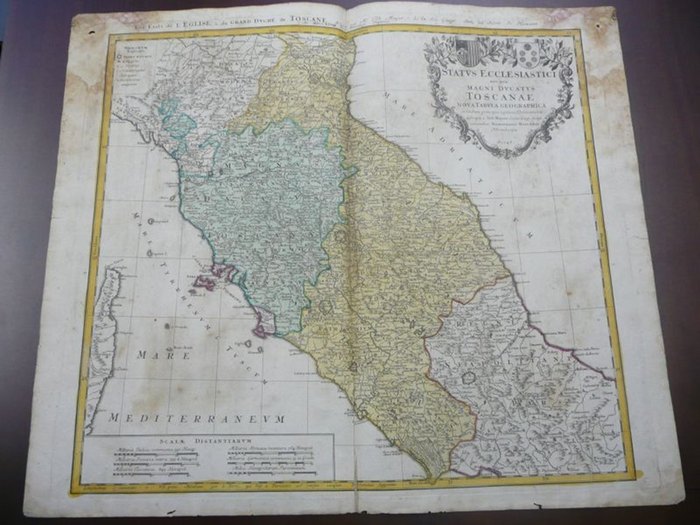 Les Etats de L' Eglise & du Grand Duche de Toscane von zwei Platten gedruckt, Orig. Kolorierter Kupferstich mit allegorisch-Heraldischer Darstellung in der rechten oberen Ecke, 1748. 61 cm x 52,5 cm, (etwas Schimmelfleckig/ einige Randeinrisse hinterlegt)---.