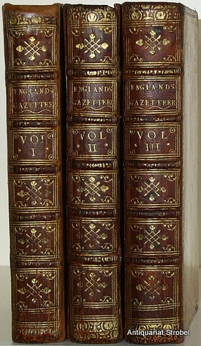 England's gazetteer, or, an accurate description of all the cities, towns, and villages of the kingdom. 3 Bände. London, Knapton, Browne, Millar, Whiston and White, 1751. VIII S., 164; 167; 209 unnumerierte Bl. 8° (17 x 11 cm). Braunes Kalbleder der Zeit mit Rückentitel, Rücken- und Stehkantenvergoldung. Erste Ausgabe. - Die beiden ersten Bände enthalten ein ausführliches Ortslexikon von A-Z ("A dictionary of the cities, corporations, market-towns, and the most noted villages; their manufactures and trade; markets, fairs, customs, and privileges; principal buildings, and charitable foundations, etc. With their distance from London, in miles, both computed, and measured"), Band III mit einem "alphabetical register of the less noted villages; with their distance, or bearing, from the next market-town, or well-known place". - Gering gebräunt und kaum fleckig, alle Titel mit altem Besitzvermerk. Die hübschen Einbände wenig bestoßen, Gelenke teils rissig, aber stabil, Kapitale und Vordergelenk von Band I sauber restauriert. *Cox III, 547.