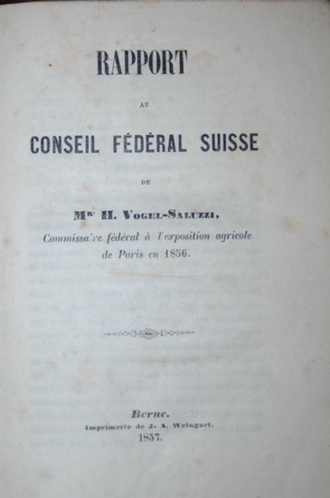 Rapport au Conseil Federal Suisse. Bern, Weingart, 1857. 79 Seiten. Contemporary hardcover binding. *Bound in together with 3 other items: I. M.R. d'Erlach: Coup d'oeil sur l'exposition de l'espece bovine au concours agricole de Paris 1856. Fribourg, Raemy, 1856. 45 pp. - II. (Dupasquier): Observations de l'agriculture a Berne en octobre 1857. Fribourg, Raemy, 1857. 38 pp. - III. A. Raemy de Bertigny: Traite d'agriculture pratique. Fribourg, Raemy, 1856. 83 (5) pp., 1 folded table. - Together 4 items, bound in 1 volume.
