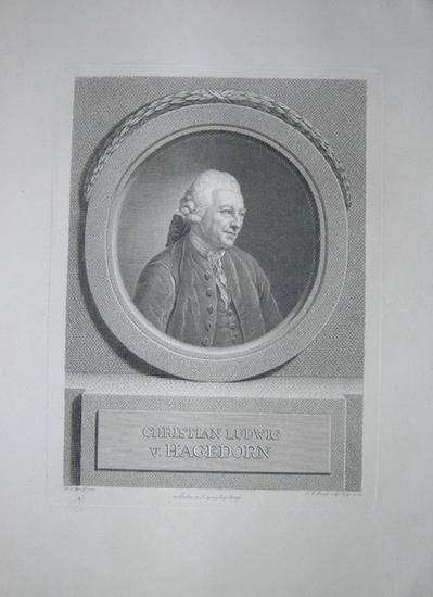 Portrait. Halbfigur nach rechts in Medaillon. Kupferstich von Johann Friedrich Bause nach Anton Graff. Leipzig, datiert 1774. Blattgröße: 400 x 275 mm - Plattengröße: 265 x 195 mm. *Christian Ludwig von Hagedorn (Hamburg) war Kunsthistoriker, Sammler, Radierer und Kunstschriftsteller, seit 1764 Direktor der Kunstakademie und der Gemäldegalerie in Dresden. - Keil 202 II. Nagler 1, S. 326 ff: Bause "gehört zu den vorzüglichsten deutschen Kupferstechern ... Die Bekanntschaft mit Wille ... gereichten ihm zu großem Nutzen ... umso verdienstlicher aber sind die Bildnisse berühmter Männer, die er mehrenteils nach den Gemälden von A. Graff stach. - Sehr sauberer und präziser Abdruck, breitrandiges Exemplar. - An den 4 äußeren Ecken alt (um 1850) auf Trägerpapier montiert. Sauber und sehr gut erhalten.
