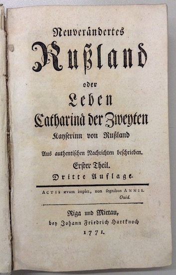 Neuverändertes Rußland, oder Leben Catharinae der Zweyten, Kayserinn von Rußland. Aus authentischen Nachrichten beschrieben. Dritte Auflage. Band 1 (von 2). Riga u. Mitau, Hartknoch, 1771. 15 Bl., 304, 216 S. (ohne das gestochene Porträt). Pappband d. Zeit (berieben u. stark bestoßen, Rücken oben mit Fehlstelle). Der Anhang enthält auf 216 Seiten Katharinas "Instruction für die zu Verfertigung des Entwurfs zu einem neuen Gesetzbuche verordnete Commißion". Schlözers Werk ist eine Sammlung von Aktenstücken u. amtlichen Darstellungen zur Reform Katharinas, bei der sich schon die Verwendung von Statistiken zeigt, wofür S. so bekannt werden sollte. In diesem Band werden behandelt der Senat, der Handel, die Abschaffung der geheimen Kanzlei u.a. - Etwas gebräunt u. stockfleckig.