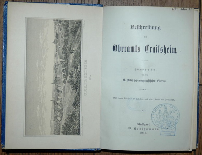 Hrsg. von dem Königlichen statistisch-topographischen Bureau. Stuttgart, Kohlhammer, 1884. 21 x 13 cm. XII, 552 Seiten. Mit 1 lithogr. Ansichten, 1 Faltkarte und 9 Tabellen. Blauer Pappband der Zeit mit handschriftl. Rückenschild. (Deckel berieben). *Enthält eine getönte Gesamtansicht von Crailsheim aus dem Jahre 1884. - Titelblatt mit entwertetem Stempel, Text sauber und gut erhalten.
