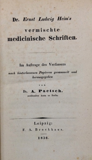 Vermischte medicinische Schriften. Im Auftrage des Verfassers nach hinterlassenen Papieren gesammelt und herausgegeben von August Friedrich Gottlieb Paetsch. Leipzig, Brockhaus, 1836. XII, 412 S. Moderner Pappband. Erste Gesamtausgabe der medizinischen, teils auch veterinärmedizinischen Schriften des "alten Heim". - Der zu seiner Zeit populärste Arzt Berlins (1747-1834) "verdankte das allseitige Vertrauen in seine Kunst der nahezu sprichwörtlich gewordenen Sicherheit rascher Diagnostik" (Hirsch/Hüb.). Zu seinen Verdiensten gehört u. a. die erste Durchführung einer Kuhpockenimpfung in Berlin 1799 sowie sein nachhaltiger Einsatz für die Genehmigung von Obduktionen zur Überprüfung von Diagnosen. Enthält u.a. Aufsätze über Scharlach, Furunkel, Ohnmacht, Pockendiagnostik und -impfung, Tobsucht, Herzentzündung, Frauenleiden, Bericht und Gutachten über verschiedene Viehkrankheiten, einige Rezensionen u.a.m. - Hirsch/Hüb. III, 128; NDB VIII, 267. - Stellenw. etwas stockfleckig.