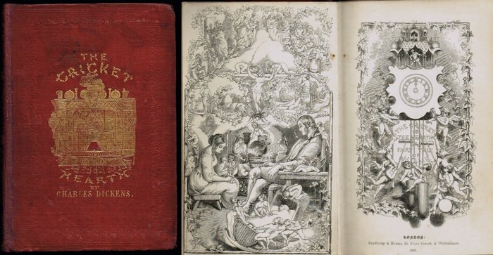The Cricket on the Hearth. Fairy Tale of Home. London, Bradbury and Evans, 1846. Kl.-8°. 4 Bl., 174 S., 2 S. Anz. Mit gestoch. Frontispiz, gestoch. Vortitel und 12 Textillustrationen von Daniel Maclise, Richard Doyle, Clarkson Standfield, John Leech und Edwin Landseer. Originalleinen mit Gold- und Blindprägung und Ganzgoldschnitt. Erstausgabe. - Zweite Variante der Anzeigenseite mit der Überschrift "New Edition of Oliver Twist". - (Rücken fachgerecht restauriert. Einband fleckig und etwas berieben).