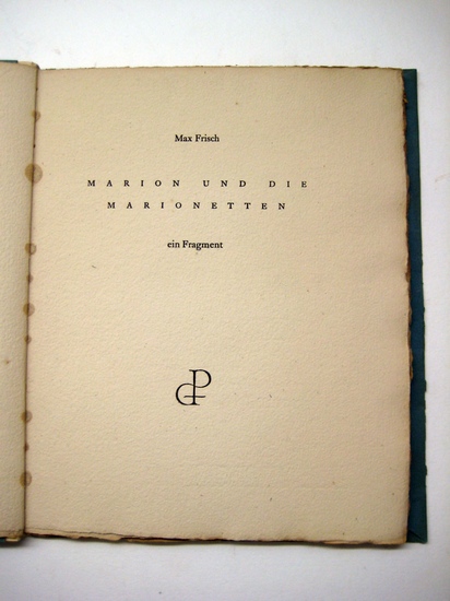 Marion und die Marionetten. Ein Fragment. Basel, Gryff-Presse 1946. 4°. 33 S., 1 Bl. Mit 16 Originalholzschnitten von Hanns Studer. Original-Kartonband. Papillons-Handdruck, 7. - Erste Ausgabe. W. G. 6. - Ex. Nr. 84 von 100 Exemplaren. - Vorderdeckel mit geklebtem Einriß. Schutzumschlag an den Rändern gebräunt und mit hinterlegten Einrissen. Vorsätzte lichtrandig. Wenig stockfleckig.