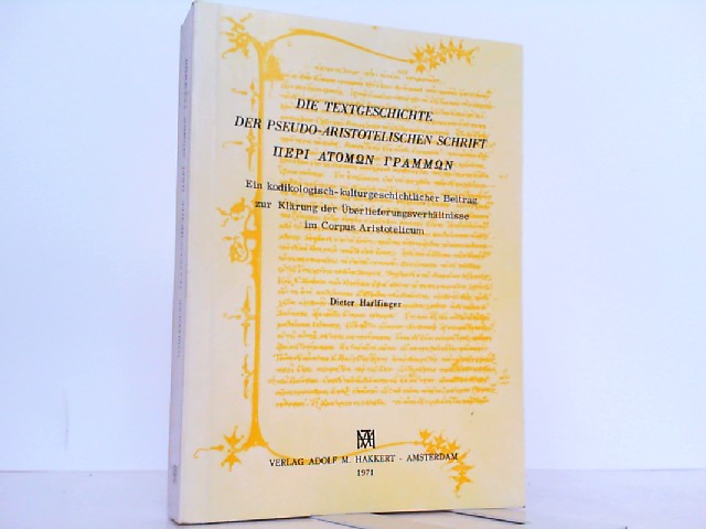 Die Textgeschichte. Der Pseudo-Aristotelischen Schrift Peri Atomon Grammon Ein Kodikologisch-Kulturgeschichtlicher Beitrag Zur Klärung Der Überlieferungsverhältnisse Im Corpus Aristotelicum. Amsterdam, Adolf M. Hakkert Verlag, 1971. 8°, 445 Seiten, farbig illustr. OKart. - sehr guter Zustand - 1971. c73302.