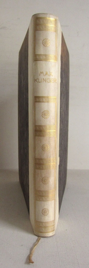 Max Klinger - Radierungen, Zeichnungen, Bilder und Skulpturen - Mit den drei vollständigen Folgen: Zeichnungen über das Thema Christus, Entwürfe zu einer Griechisch-Römischen Gedichtsammlung, "Eine Liebe" Rad. Op. X - Quart-Ausgabe - 1914 Franz Hanfstaengl, München, 1914. Diese Ausgabe, auf Vand Gelder Bütten gedruckt, ist in einer Auflage von 1000 numerierten Exemplaren hergestellt; der vorliegende Band erhielt die No. 794; Inhalt: Abbildungen im Text: Katzenjammer; Kinderstudie; Der Pflasterer; Amor, Tod und Jenseits; Simplizius und der Einsiedler; Rivalen; u.a. Vollblätter: Japanerin (Farbtafel); Am Strande; An der Mauer; Bär und Elfe; Beethoven; Brahms-Denkmal; Christus im Olymp; Diplom des Vereins der Spiritusfabrikanten; Das Drama; Der Gefangene; Die Gesandtschaft; Leda; Gewandstudie; Kassandra; Nymphe und Faun; Salomé; Sirene; Soirée; Tänzerin; Zinsgroschen; Christi Höllenfahrt; Urteil des Paris; u.a.m. 141 S. Pergamentrücken mit goldgepr. Rückentitel und reicher goldgepr. Rückendekoration, Kopfschnitt vergoldet; Einband etwas lichtrandig, kaum angeschmutzt, minimal bestoßen, Schnitt sauber, Bild- und Textseiten sauber, vereinzelt Stockflecke auf den Pergamin-Schutzblättern der Bildseiten, Deckel-Innenseiten sehr gering angeschmutzt, guter Zustand. ca. 1600 gr. Shipping costs to non-EU states have significantly increased - please inquire. 4°.