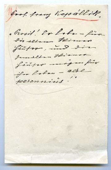 Eigenh. Manuskript mit Namenszug in der Kopfzeile. O. O. u. D., [wohl Wien, November oder Dezember 1911]. ? S. Gr.-8vo. Manuskript einer Tischrede auf die eigene Person, zu der die namentlich nicht genannte Redaktion der "Österreichischen illustrierten Zeitung" aufgefordert hatte: "Prosit! Er lebe für die alten Wiener Häuser, und die gemalten Wiener Häuser mögen für ihn leben - aere perennius!" - Der Bruder des Theologen Joseph Kopalliks besuchte den Lehrerbildungskurs an der Wiener Kunstgewerbeschule, unterrichtete bis 1919 als Zeichenlehrer an Mittelschulen und wurde 1890 Mitglied der Wiener Künstlergenossenschaft. "Er arbeitete vorwiegend für den Hof und den Hochadel und schuf vor allem topographische Darstellungen, u. a. 'Schloß Persenbeug' (1884), 'Innenansicht des alten Burgtheaters' (1887) und 'Schloß Peterhof bei St. Petersburg' (1899). 1892 erschienen fünfzig Original-Illustrationen zur Erweiterung Wiens unter dem Titel 'Aus meiner Vaterstadt'" (DBE). - Etwas angestaubt und mit kleinen redaktionellen Notizen in rotem Farbstift.