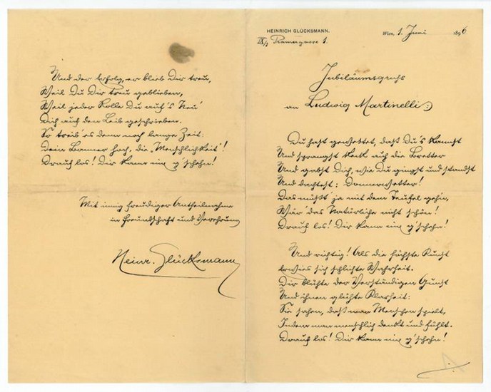 "Jubiläumsgruß an Ludwig Martinelli". Eigenh. Gedicht mit U. Wien, 1. VI. 1896. 1? SS. (21 Zeilen) auf Doppelblatt. 8vo. "Du hast gewettet, daß Du's kannst / Und sprangst keck auf die Bretter / Und gabst Dich, wie Du gingst und standst / Und dachtest: Donnerwetter! / Das müßt' ja mit dem Teufel geh'n! / Wär' das Natürliche nicht schön! Drauf los! Dir kann nix g'schehn! [...]". - Heinrich Glücksmann war seit 1882 Redakteur verschiedener Budapester und Wiener Zeitungen (u. a. des "Neuen Pester Journals" und der "Wiener Allgemeine Zeitung") und fungierte 1900/01 als Chefredakteur des "Wiener Tagblatts" und 1903 als Chefredakteur der "Neuen Zeitung". 1910 wurde er Dramaturg des Deutschen Volkstheaters in Wien, später Professor an der Wiener Schauspielschule. Daneben trat er mit zahlreichen Vorträgen über Literatur und Kunst hervor, veröffentlichte freimaurerische Schriften und schrieb Dramen (u. a. "Der blanke Hans", 1908), Lustspiele und Gedichte (u. a. "Fährten und Narben", 1913). Von 1896 bis 1919 gab er die freimaurerische Zeitschrift "Der Zirkel" heraus und von 1919 bis 23 die "Wiener Freimaurer-Zeitung". - Auf Briefpapier mit gedr. Briefkopf.