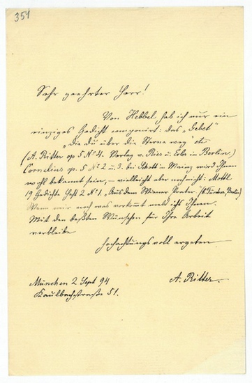 Eigenh. Brief mit U. München, 2. IX. 1894. 1 S. auf Doppelblatt. 8vo. An einen namentlich nicht genannten Adressaten: "Von Hebbel hab ich nur ein einziges Gedicht componirt: Das 'Gebet' 'Die Du über die Sterne weg' etc. [...]. Cornelius op. 5 No. 2 u. 3 bei Schott in Mainz wird Ihnen wohl bekannt sein, - vielleicht aber noch nicht: Mottl 19 Gedichte Heft 2 No. 1 'Aus dem Wiener Prater' (B. Fürstner, Berlin). Wenn mir noch was vorkommt meld ichs Ihnen [...]".