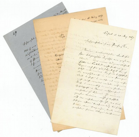 3 eigenh. Briefe mit U. Santiago de Chile und Kassel, 15. XI. 1857. Zusammen (1+2?+1? =) 5? SS. auf 6 Bll. 8vo. An den Astronomen Wilhelm Förster: "Als ich vor einigen Tagen meine Correspondenz durchblätterte, fand ich das beiliegende Blatt mit den Beobachtungen der Euphrosyne, welche ich Ihnen in meinem Schreiben von. 29. Juni d. J. mittheilen wollte. Ich kann nicht erinnern, ob dieses Blatt für Sie bestimmt war, oder ob ich dasselbe als Copie hier zurückließ. Sollten gedachte Beobachtungen meinem erwähnten Briefe nicht beigelegt worden sein, so würde ich Sie ergebenst ersuchen, dieselben dem Herrn Dr. Winnecke gefälligst zu übersenden, wenn deren Veröffentlichung in den Astr[onomischen] Nach[richten] als verspätet, nicht zweckmäßig erscheinen sollte [...]" (a. d. Br. v. 15. XI. 1857). - K. W. Moesta war anfangs Mathematik- und Physiklehrer an der Realschule zu Eschwege und "ging dann mit der Gillisschen Epedition nach Chile, wo er 1852 Direktor der neuen Sternwarte in Santiago wurde" (Clemens Schaefer (Hrsg.): Briefwechsel zwischen Carl Friedrich Gauss und Christian Ludwig Gerling, Berlin, Otto Elsner, S. 776, Anmerkung 1).
