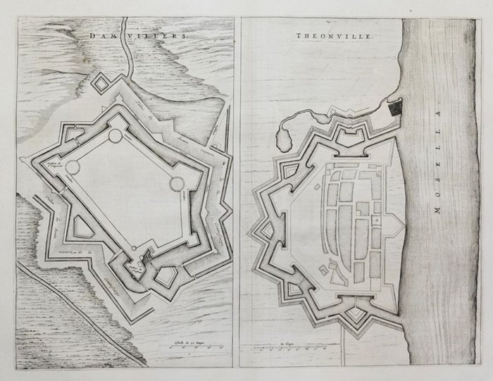 Vogelschauplan von Damvillers und Thionville. 2 plans à vol d'oiseau Amsterdam, Kupferstich von J. Blaeu, 1649. 36,5x48,5 cm. Gravure sur cuivre de J. Blaeu, Amsterdam, 1649, 36,5x48,5 cm.