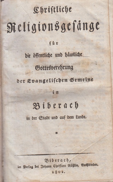 Christliche Religionsgesänge für die öffentliche und häusliche Gottesverehrung der Evangelischen Gemeine in Biberach in der Stadt und auf dem Lande Nüßlin Biberach, 1802. 788 S. Ledereinband. Einband stärker berieben und bestoßen, mit Goldschnitt, Seiten altersbedingt fleckig und gewellt, Name auf fliegendem Blatt.