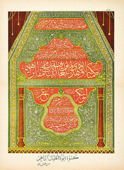 Die Draperie an der "Makam Ibrahim" (Station des Abraham) in Mekka. [Weißenburg, Burckardt, zw. 1880/88]. Farblithographie. Blattgr.: 43 x 33,3 cm. Einer der sehr seltenen Weißenburger Bilderbögen mit orientalischen Motiven. Diese wurden unter der Adresse des Hassan Uwais (Auvès) in Kairo gehandelt. Der eigentliche Verleger, Camille Burckardt, führte die Weißenburger Bilderfabrik von 1880-88. - Leichter Mittelfalz, geringfügige Läsuren, Ränder ein wenig gebräunt. - Des Mondes de Papier S. 66, Nr. 2.