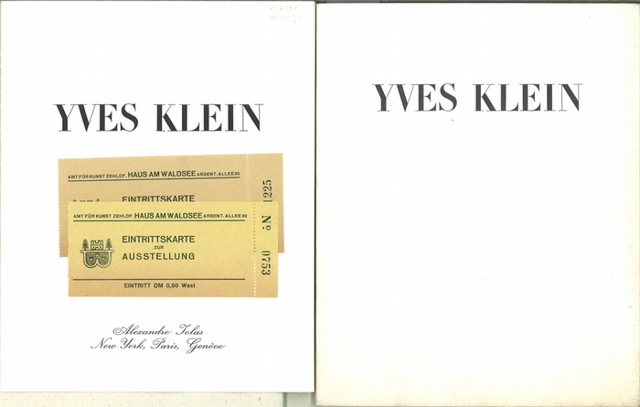 Yves Klein. (à Paris, Galerie Alexandre Iolas 196, Boulevard Saint-Germain. à Genève 14, Rue Etienne-Dumont. à New York Alexandre Iolas Gallery 15. E. 55th. Street.). Paris u.a., Iolas, 1965. o. Pag. [19 Bll.] OBrosch. m. OSch., Abbildung2|Abbildung 1. In franz. und engl. Sprache. Beiliegend: Eintrittskarten und Preisliste zur Ausstellung sowie das eingebunden Essay "Une Aventure Prométhéenne aus Service d'une Intuition Cosmique". - Angestaubt, leichte Gbrsp.