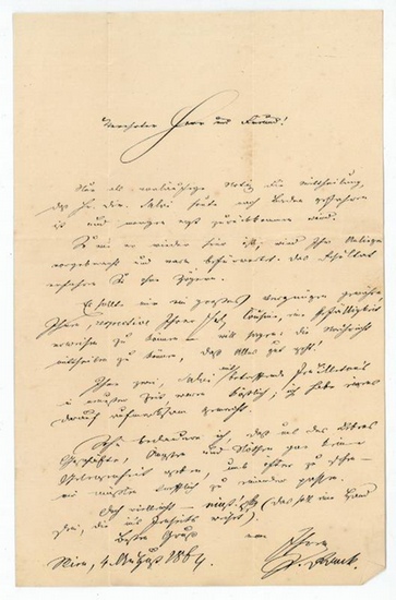 Eigenh. Brief mit U. Wien, 4. VIII. 1864. 1 S. auf Doppelblatt. Gr.-8vo. An einen namentlich nicht genannten Adressaten: "Nur als vorläufige Notiz die Mittheilung daß Hr. Dir. Salvi heute nach Baden gefahren ist und morgen erst zurückkommen wird. So wie er wieder hier ist, wird Ihr Anliegen vorgebracht und warm befürwortet. Das Resultat erfahren Sie ohne Zögern. Es sollte mir ein großes Vergnügen gewähren, Ihnen, respective Ihrer Frl. Cousine, eine Gefälligkeit erweisen zu können, daß Alles gut geht! [...]". - Der in Friedrichsthal im Böhmerwald geborene und zu Wien verstorbene Autor war ursprünglich für den geistlichen Beruf bestimmt, begann aber 1836 in Wien zu studieren. Seit 1838 sich zur Gänze seiner schriftstellerischen Tätigkeit widmend, wurde Rank insbesondere durch seinen Erzählband "Aus dem Böhmerwalde" (1843) bekannt. Auf Grund von Schwierigkeiten mit der Zensur wegen seiner Zugehörigkeit zur jungösterreichischen Bewegung ging er 1845 für einige Zeit nach Leipzig, 1848 wurde er Mitglied des Frankfurter Parlaments, schloß Freundschaft mit Ludwig Uhland und verkehrte im Kreis um Justinus Kerner und Gustav Schwab. In den fünfziger Jahren in Frankfurt a. M. und Weimar lebend, gab Rank von 1855 bis 1857 das "Weimarer Sonntagsblatt" heraus. 1861 wieder nach Österreich zurückgekehrt, wurde er Redakteur der "Österreichischen Zeitung", war von 1865-74 Direktionssekretär der Hofoper in Wien und hielt daneben Vorträge über Ästhetik und Geschichte an der Hofopernschule. 1876-78 war er Generalsekretär des Wiener Stadttheaters und 1882/83 verantwortlicher Redakteur der von Ludwig Anzengruber herausgegebenen belletristischen Zeitschrift "Heimat". Seine 1896 von August Sauer herausgegebenen "Erinnerungen" "entwerfen ein lebendiges Bild der Vormärzzeit" (DBE; vgl. auch Kosch III, 2157).