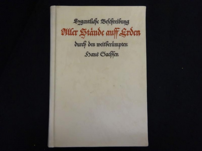 Eygentliche Beschreibung Aller Staende auff Erden/Hoher und Nidriger/Geistlicher und Weltlicher/Aller Kuensten/Handwercken und Haendeln/u. vom groesten biß zum kleinesten/Auch von jrem Ursprung/Erfindung und gebreuchen. Durch den weitberuemten Hans Sachse. Mit Roem. Keys. Maiest. Freyheit Gedruckt zu Franckfurt am Mayn 1568 (bey Georg Raben/in verlegung Sigmund Feyerabents). Faksimilereproduktion Edition Leipzig 1966. unpag., jede Seite einseitig bedruckt mit Vers u. Holzschn. der jeweiligen Berufe, OPgt. in OPappschuber. Tadellos. Namenszug am inneren Rückendeckel.