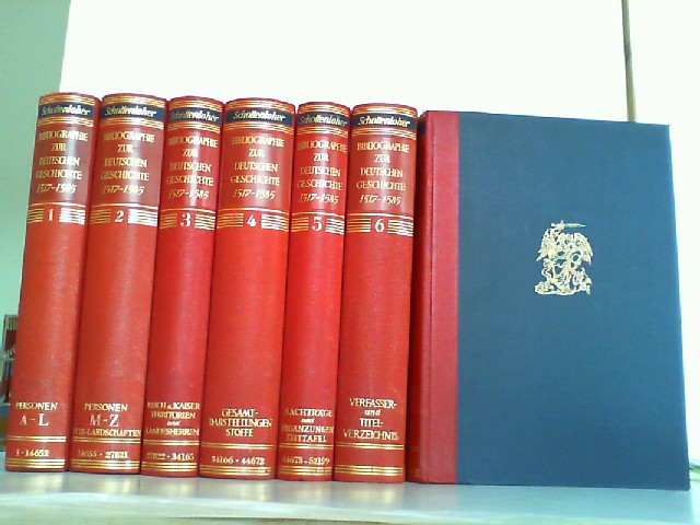 Bibliographie zur deutschen Geschichte im Zeitalter der Glaubensspaltung 1517-1585. Hier Band 1-7 in 7 Büchern KOMPLETT ! Stuttgart, Hiersemann, 1960. 7 Bände komplett: Vol. 1. Personen A - L, Orten und Landschaften: xij, 632 Seiten. / Vol. 2. Personen M - Z, Orte und Landschaften: xij, 760 Seiten. / Vol. 3. Reich und Kaiser, Territorien und Landesherren: viij, 570 Seiten. / 4. Gesamtdarstellungen, Stoffe: viij, 762 Seiten. / 5: Nachträge, Ergänzungen, Zeittafel: viij, 546 Seiten. / 6: Verfasser- und Titelverzeichnis: viij, 678 Seiten. / VII: Das Schrifttum 1938-1960. Illustrierte und betitelte Original-Halblederbände mit Goldprägung - guter zustand - 1956-1966. M243.