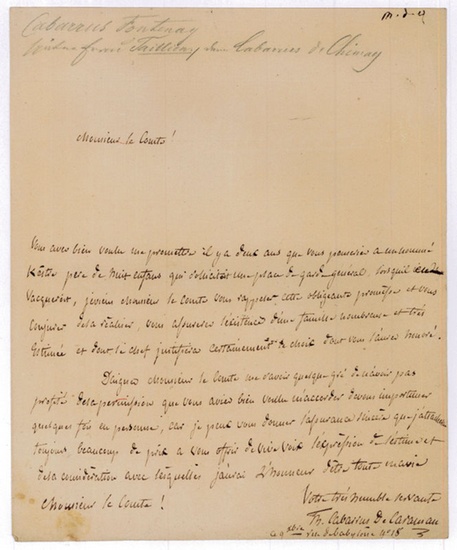 Autograph letter signed ("Th. Cabarrus De Caraman"). "Rue de Babylone" (Paris), 12 Dec. (no year). Small 4to. 1 p. on bifolium. To Monsieur le Comte, reminding him of his promise to support a poor family: "Monsieur le Comte! Vous avez bien voulu me promettre il y a deux ans que vous penseriez a un nommé Késtie [?] père de huit enfans qui sollicitait une place de garde générale [?], je viens Monsieur le Comte vous rappeler cette obligeante promesse et vous conjurer de la réactiver, vous assurer l'existence d'une famille nombreuse et très estimée et dont le chef justifiera certainement le choix dont vous l'aurez honorez [?]". - Slightly browned, and small tear at bottom.