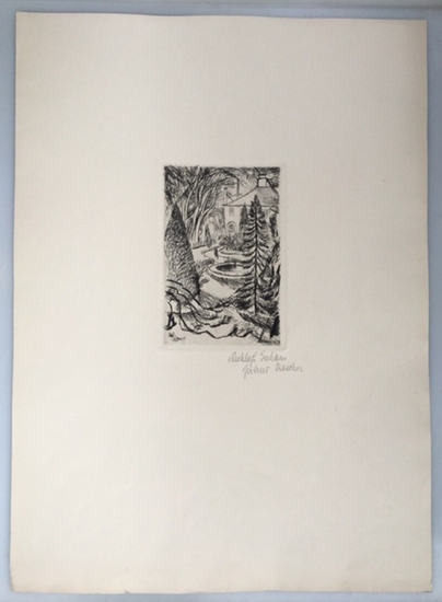 Garten mit Brunnen, Original-Radierung mit sehr breitem Plattenrand, [1915]. 9,2x14,2 (Motiv), 32x45 (Blatt),. SEHR SELTENE UND GESUCHTE DRUCKGRAPHIK von Seehaus, Rave 9 b, aus der Auflage von nur 25 Stück mit Nachlass-Signatur von Gertrud Drascher, kräftiger Abdruck.